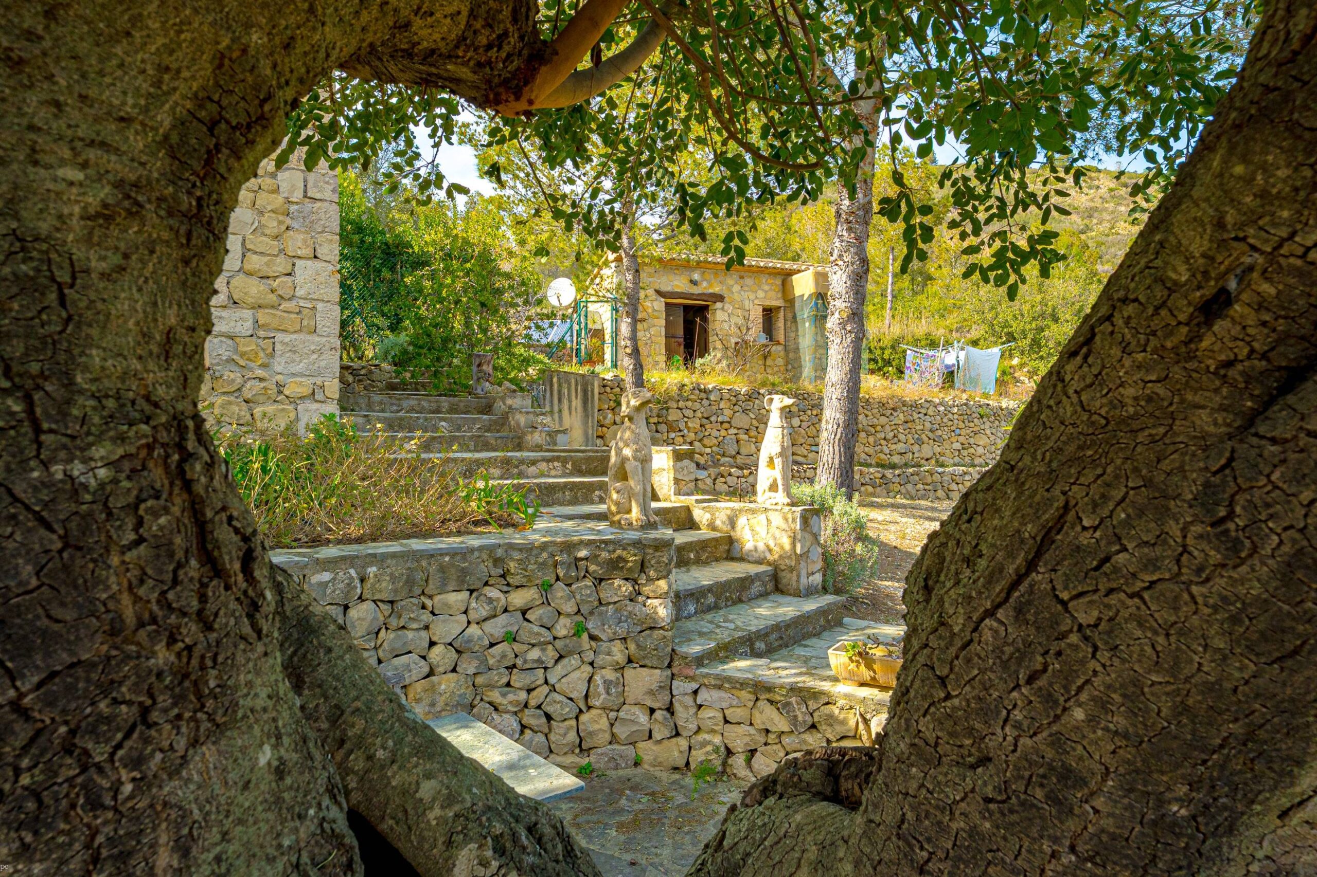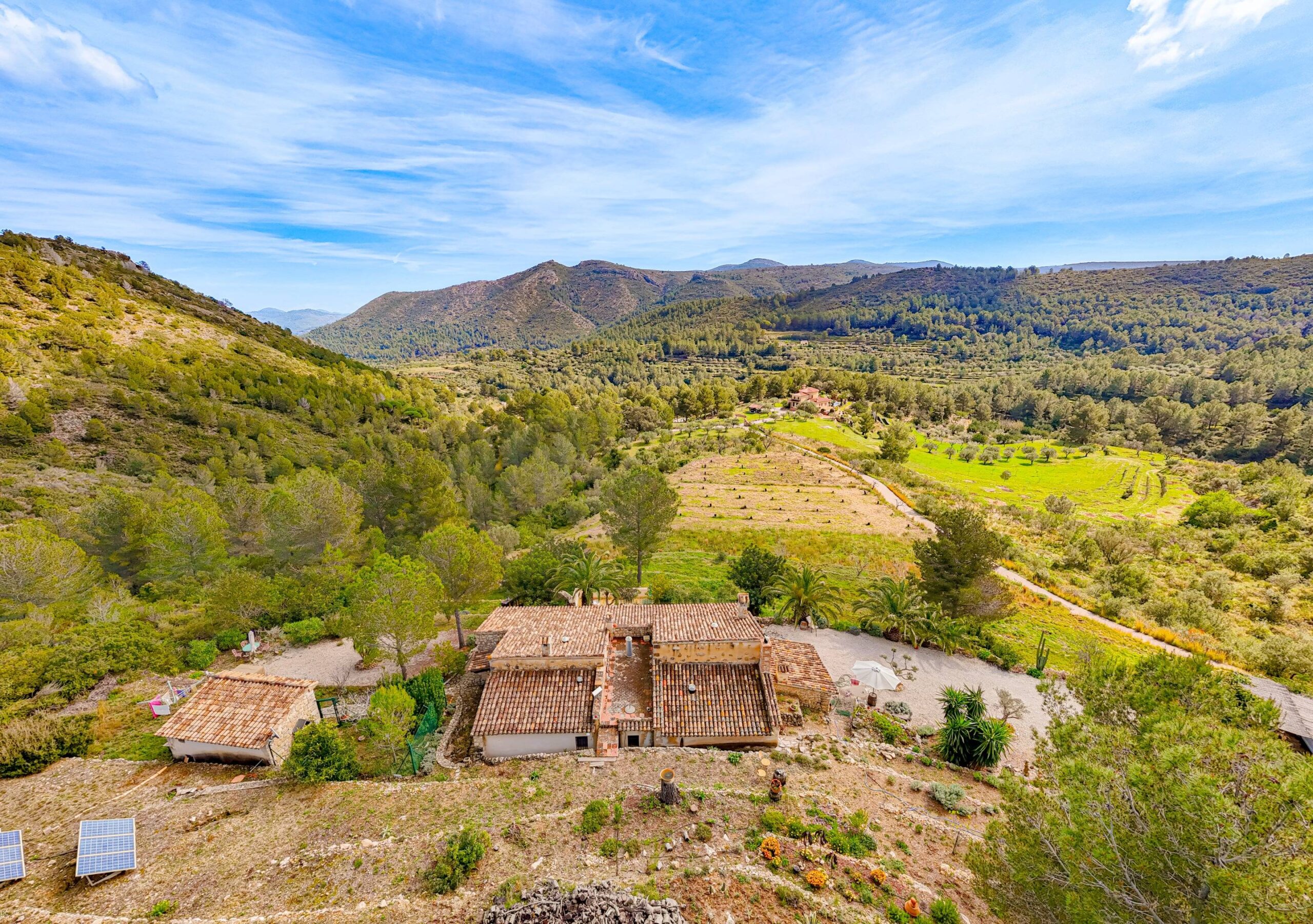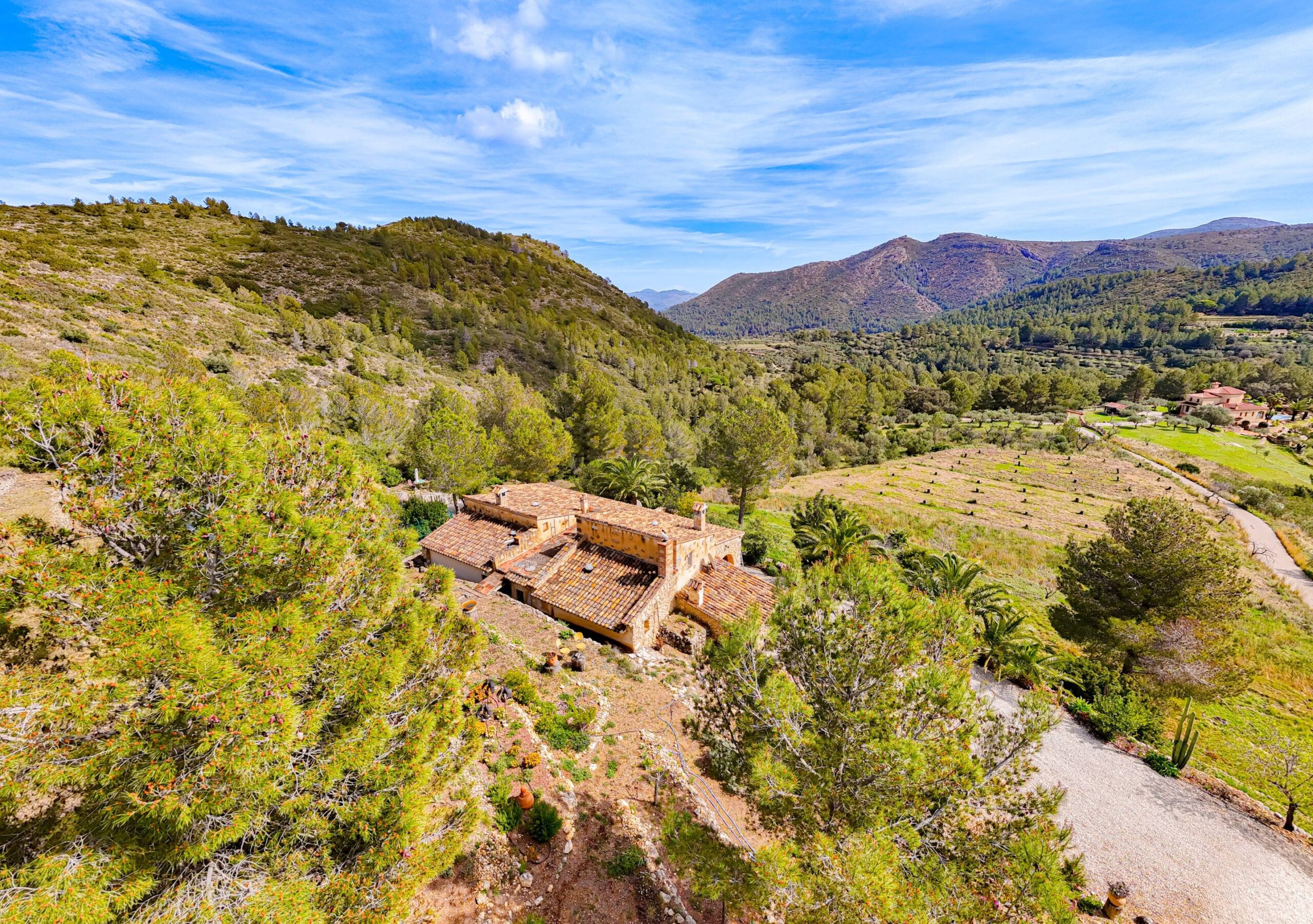 La propriété est accessible par un portail et s’étend sur un terrain spacieux de plus de 9 000 m², offrant intimité, végétation méditerranéenne attrayante et paysage ouvert dans toutes les directions. L’allée permet de garer plusieurs voitures et un camping-car, ce qui est pratique pour les résidents et les invités. Depuis de nombreux endroits de la propriété, la vue vers le sud s’étend magnifiquement sur la vallée et les montagnes environnantes.
