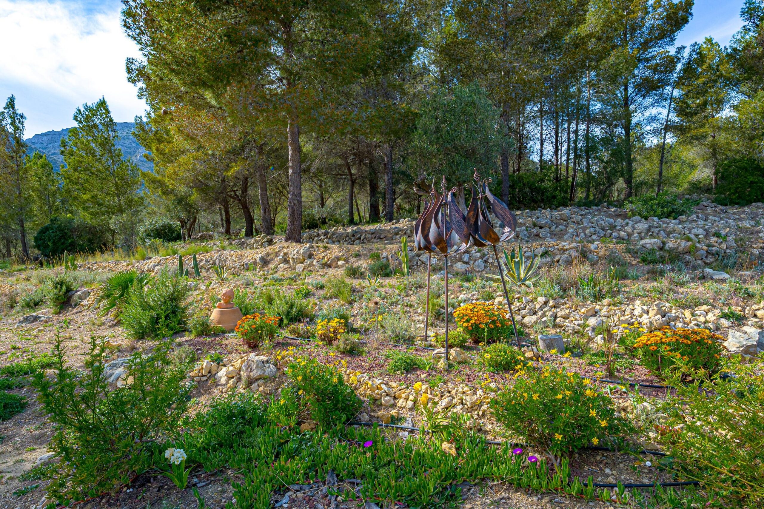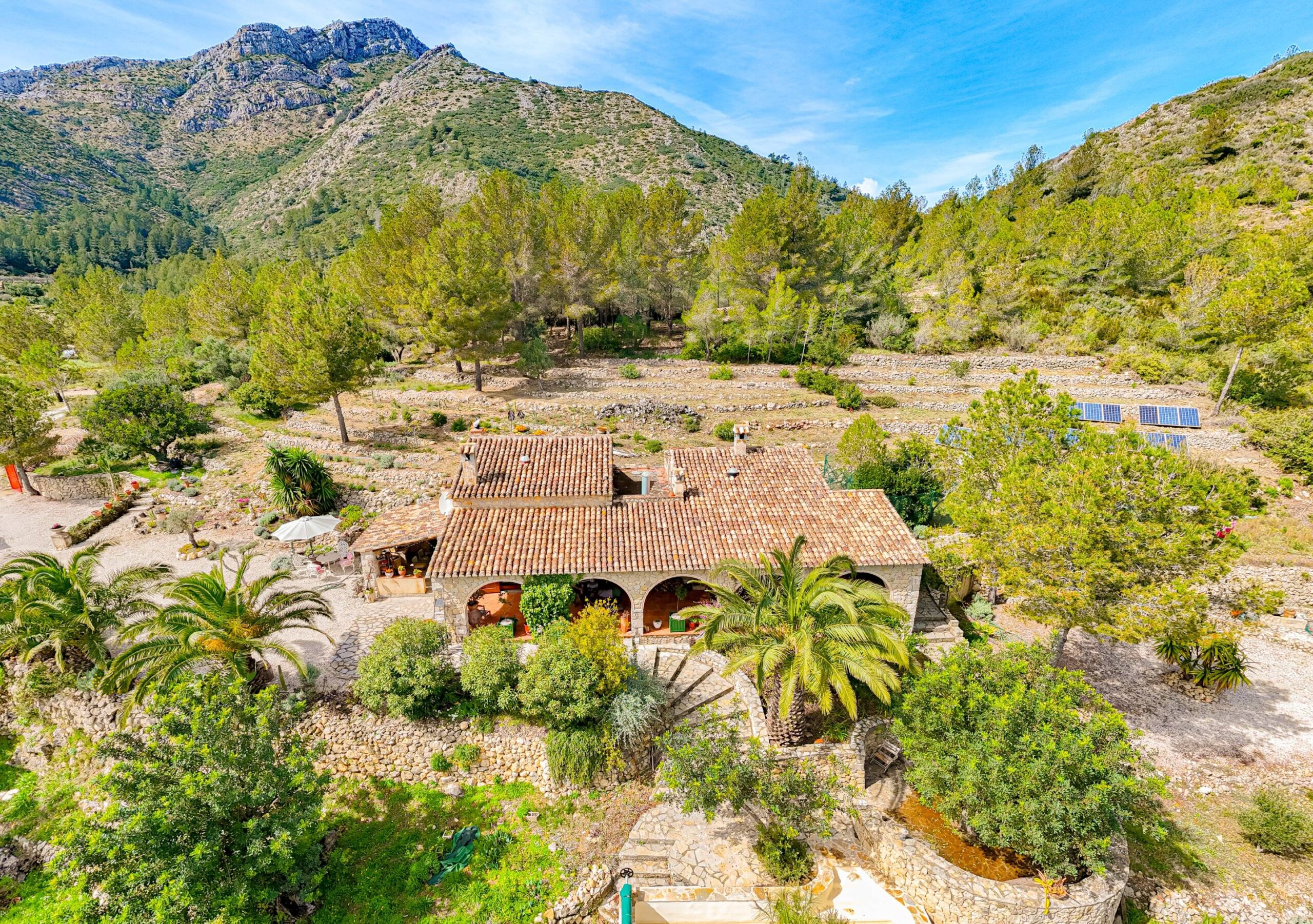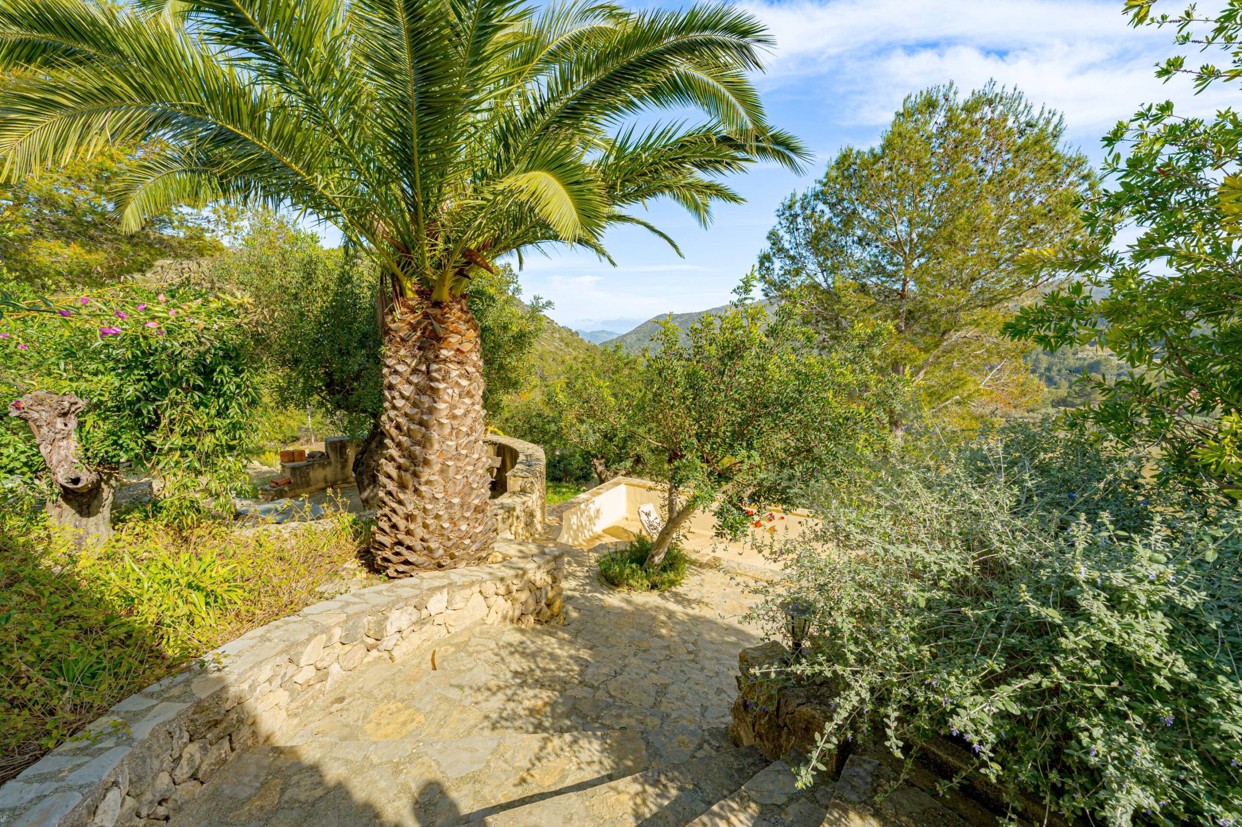 La propriété est accessible par un portail et s’étend sur un terrain spacieux de plus de 9 000 m², offrant intimité, végétation méditerranéenne attrayante et paysage ouvert dans toutes les directions. L’allée permet de garer plusieurs voitures et un camping-car, ce qui est pratique pour les résidents et les invités. Depuis de nombreux endroits de la propriété, la vue vers le sud s’étend magnifiquement sur la vallée et les montagnes environnantes.
