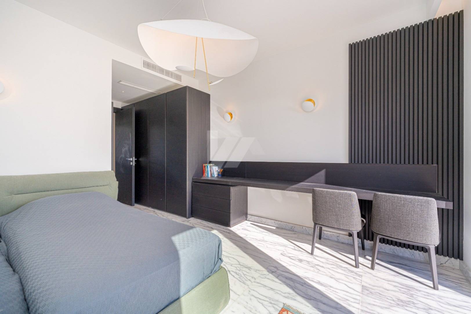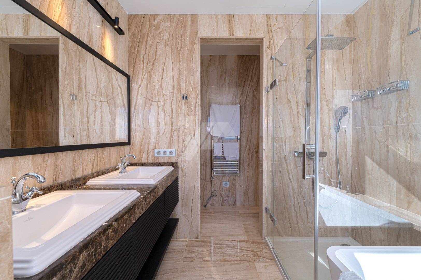 En la planta superior, la villa ofrece una lujosa suite principal con vestidor y un baño completo con bañera y ducha a ras de suelo. Un segundo dormitorio de gran tamaño, también con baño privado, completa esta planta. Ambas estancias dan directamente a una amplia terraza, desde la que se pueden disfrutar de agradables vistas al mar.